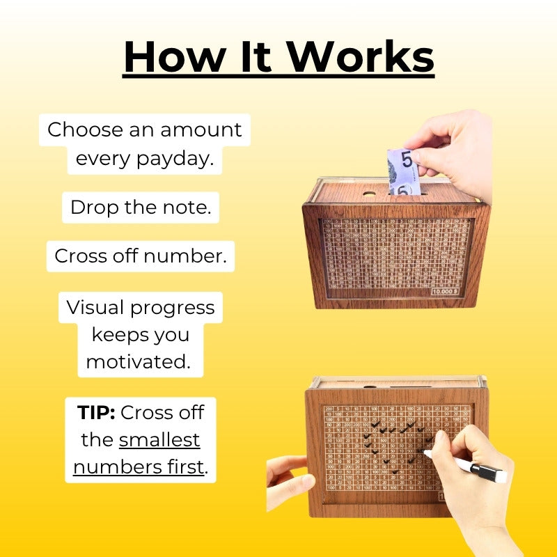 To reach your chosen goal, simply drop your spare change in the box and mark the amount off.
