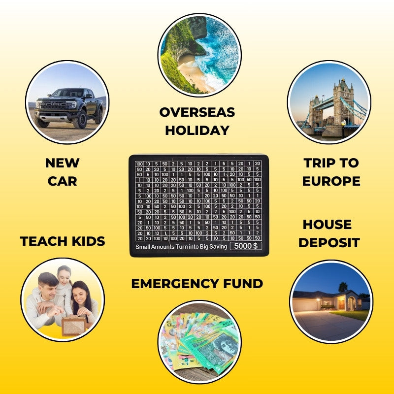 Box comes with 8 sheets of saving goals and 2 blank sheets so you can choose your goal and stick on box.